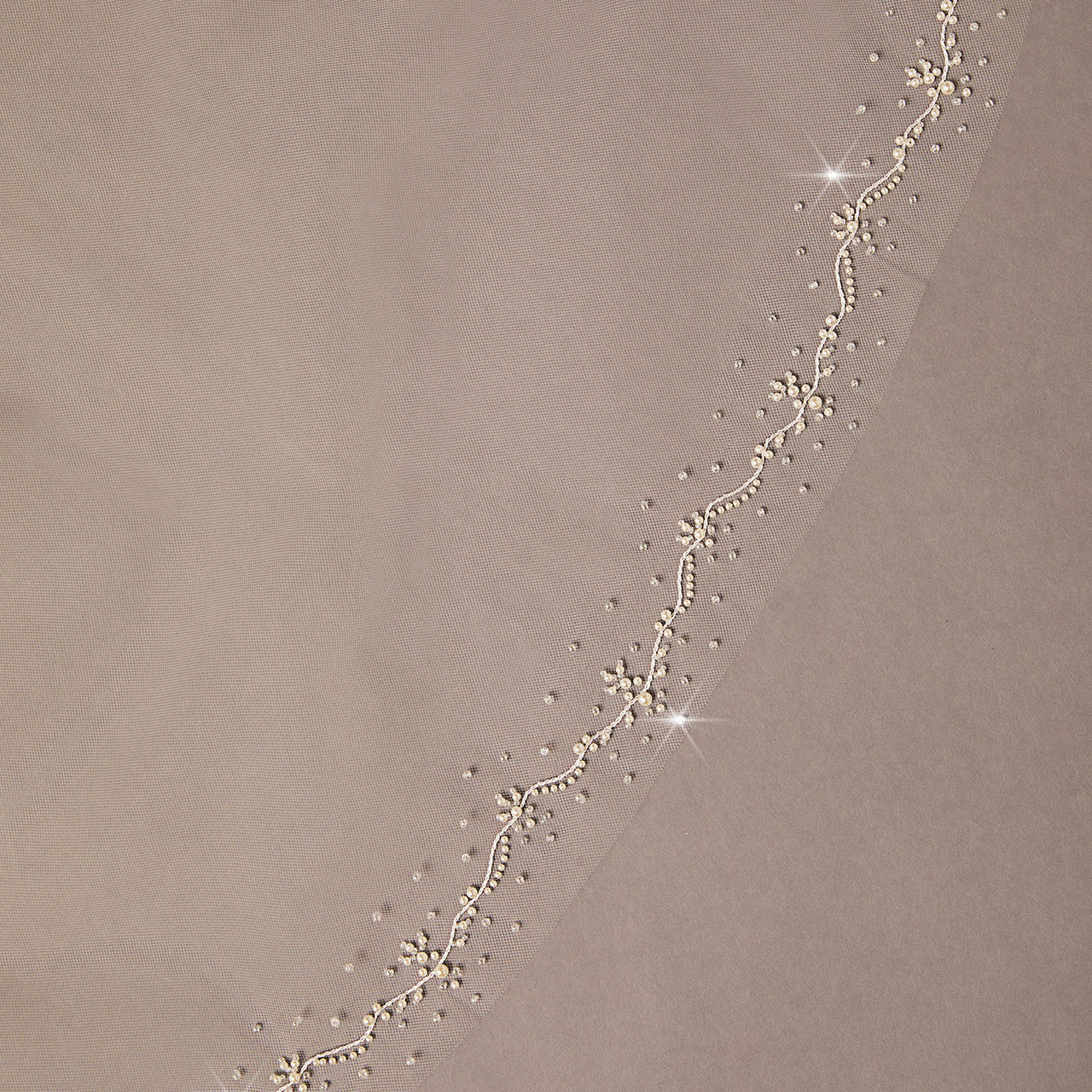 Description: English tulle with braided cord, pearl, and clear beaded edge