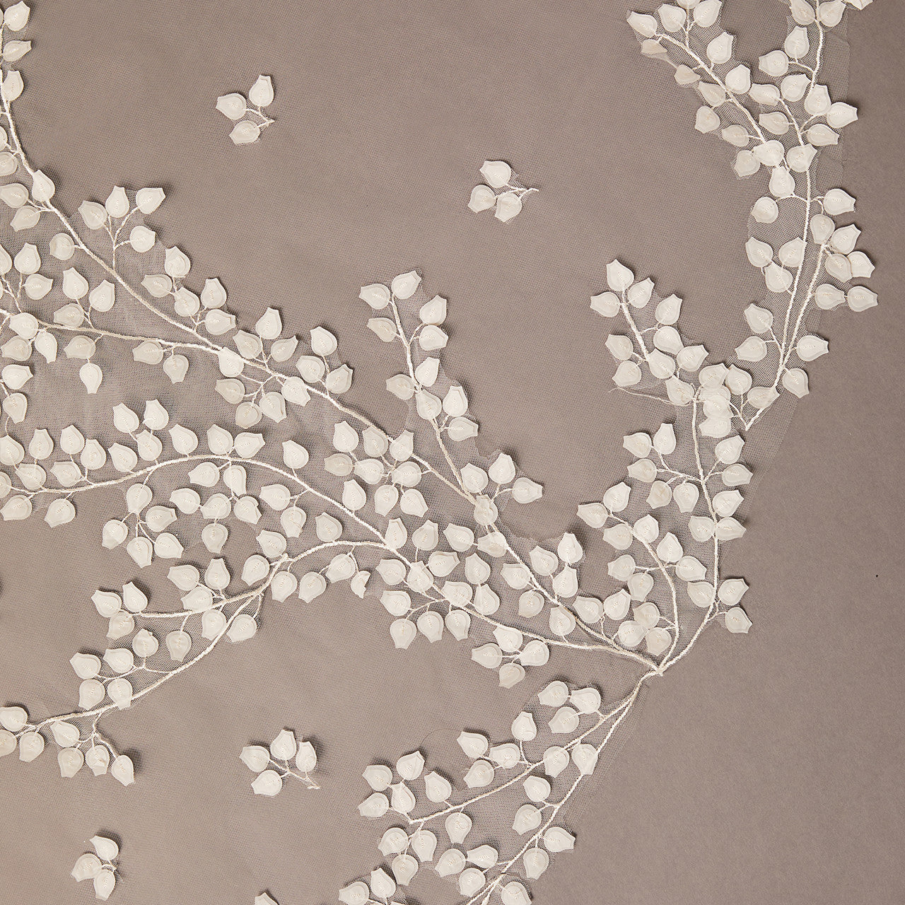 Description: English tulle with scattered organza flower appliques with exaggerated clover cut